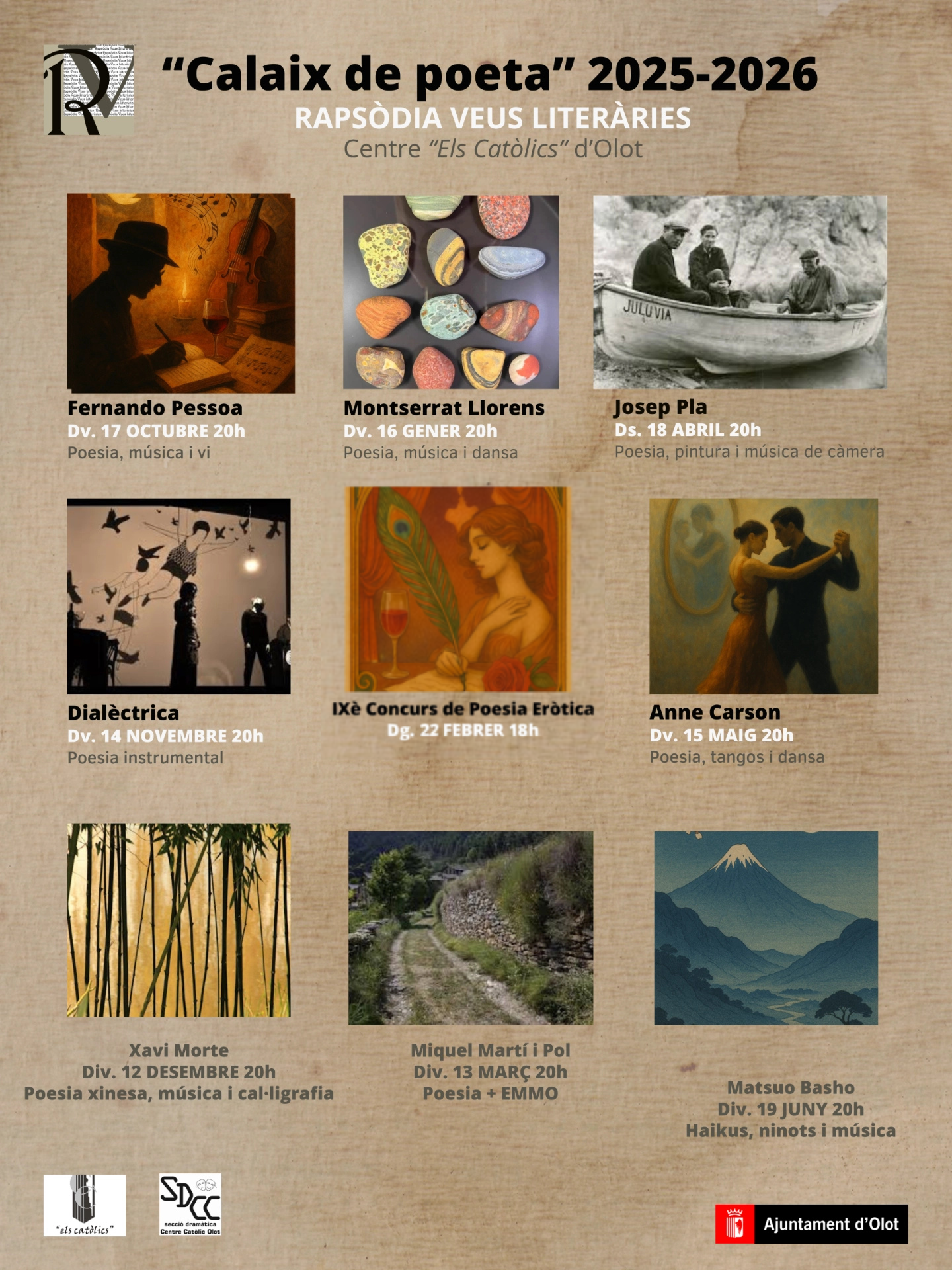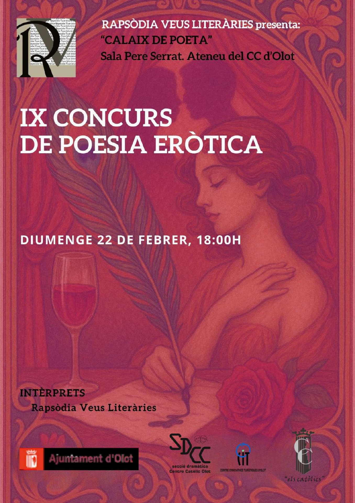 Amb la col·laboració de l'Ajuntament d'Olot, del Centre d'Iniciatives Turístiques, de la Secció Dramàtica del Centre Catòlic i de l'Ateneu Associació Centre Catòlic, el proper 22 de febrer de 2026 a les 18 h a la sala Pere Serrat de l'Ateneu Centre Catòlic, es presentarà el lliurament de premis del 9è Concurs de Poesia Eròtica d'Olot.